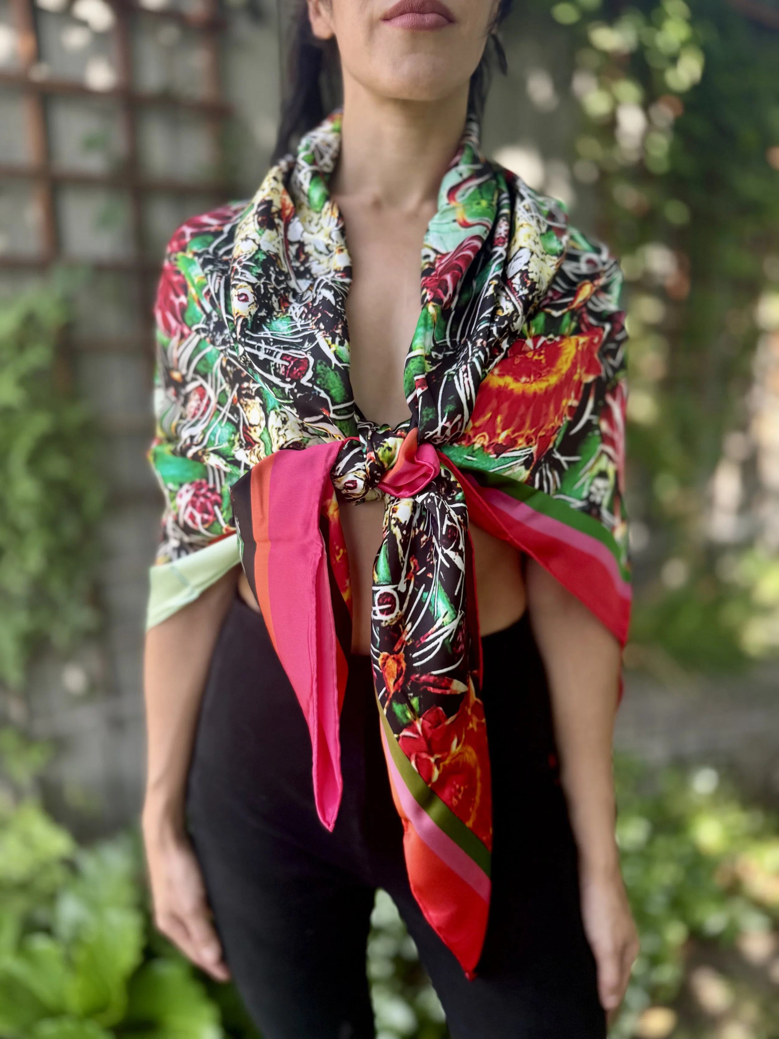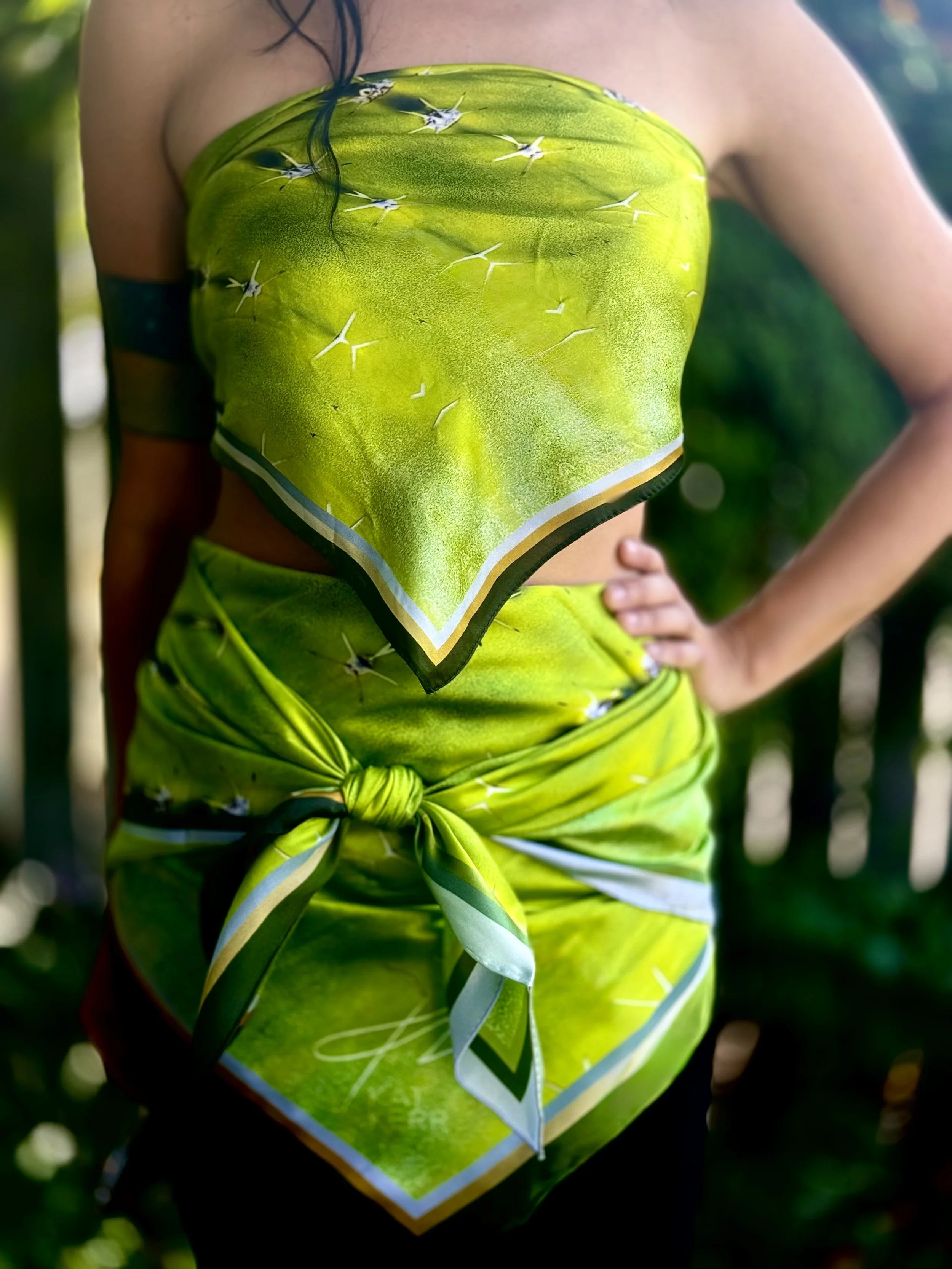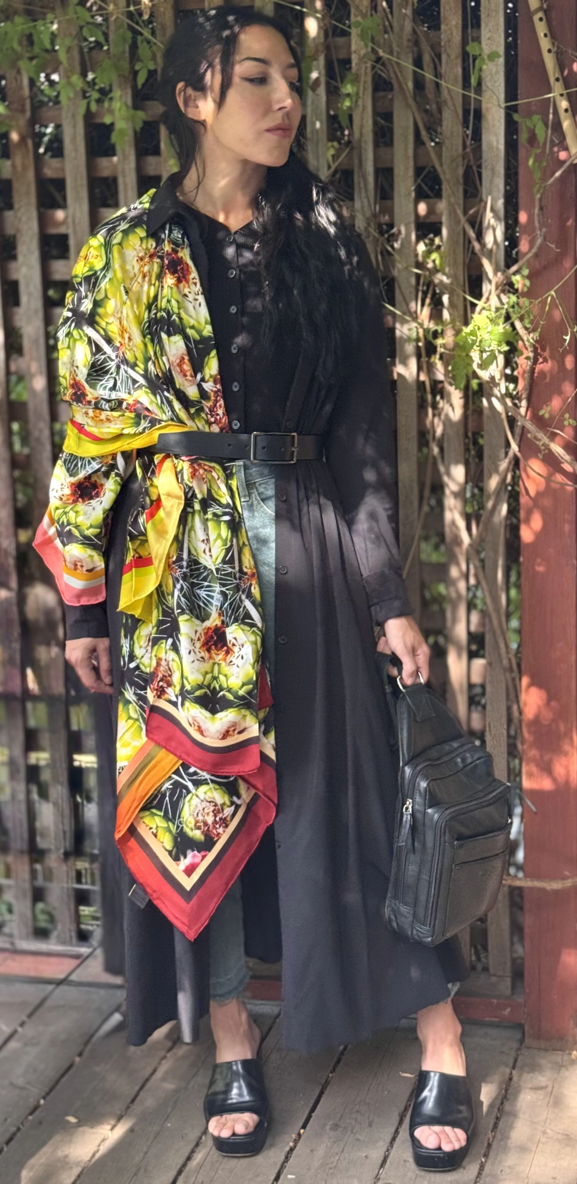 A promise of fierce evolution in motion. Shedding skins, breaking patterns, and emerging anew. This design pulses with symmetrical energy, like wings unfurling or desert winds reshaping the land. A bold contrast of ivory, charcoal, sage, and ember red makes this piece feel alive, like it’s always on the edge of becoming. Geometric yet organic, this scarf speaks to those bold enough to rewrite, reshape, rebloom. For the ones becoming something braver - wear your evolution.